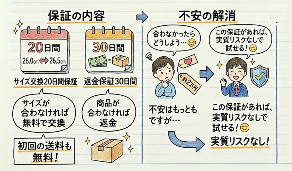 サイズの問題は20日間の無料交換、価格への不安は30日間の返金保証で対応できます。