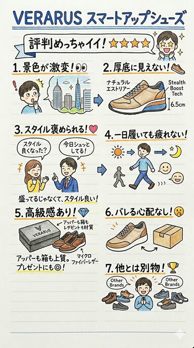 「30足以上のシークレットシューズを試した結果、VERARUSがバレない・疲れない・ダサくないを最も高いレベルで両立している」という口コミがありました。